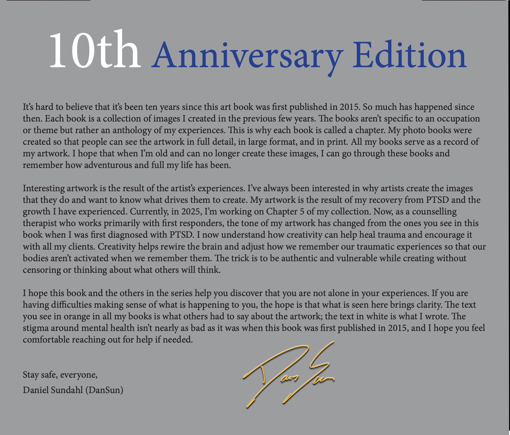 It’s been ten years since I published my first artbook – Portraits of an Emergency Chapter 1. This book has been out of print and unavailable for several years, but is now available again in this special 10th anniversary edition. This edition includes remastered images and an additional artist forward.